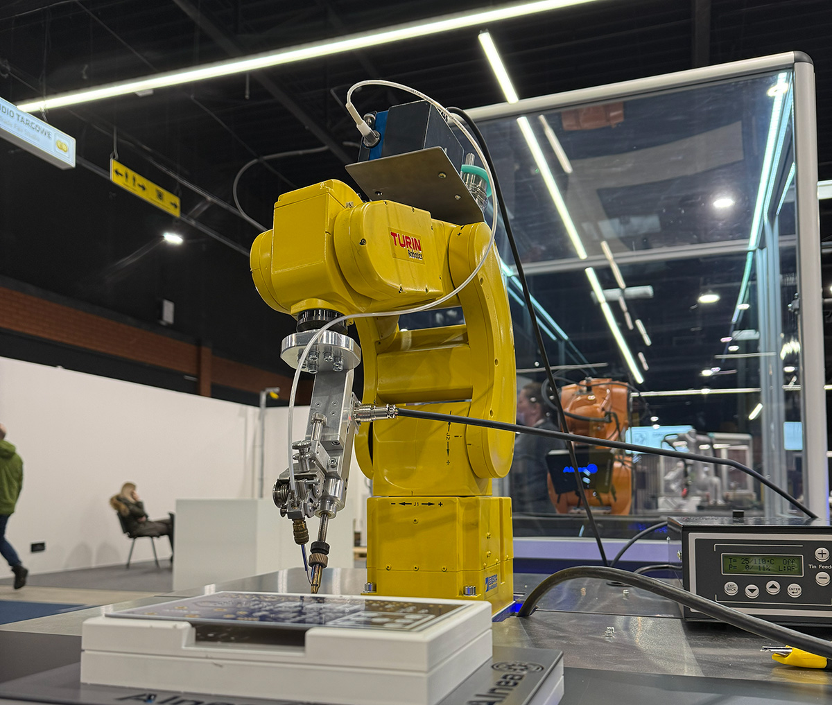 Robot TR01-370 w aplikacji lutowania pozwalał pokazać w praktyce, jak wygląda zautomatyzowany proces wymagający stabilnych parametrów i dokładnego prowadzenia narzędzia. Rozmowy dotyczyły głównie dopasowania takiego rozwiązania do produkcji seryjnej oraz kontroli jakości.